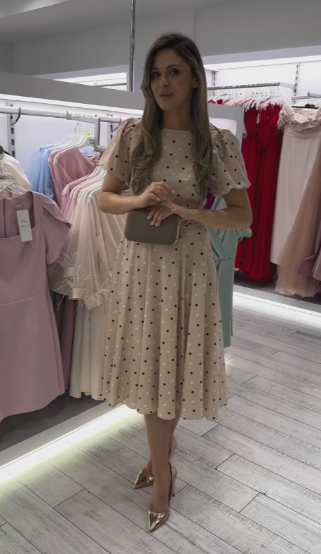 Sukienka w groszki z bufiastymi rękawami i dopasowaną talią i szeroką spódnicą