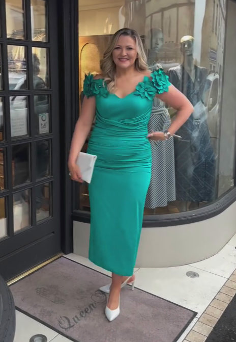 Dopasowana sukienka z dekoltem w serek, trójwymiarowymi kwiatowymi zdobieniami i plisami
