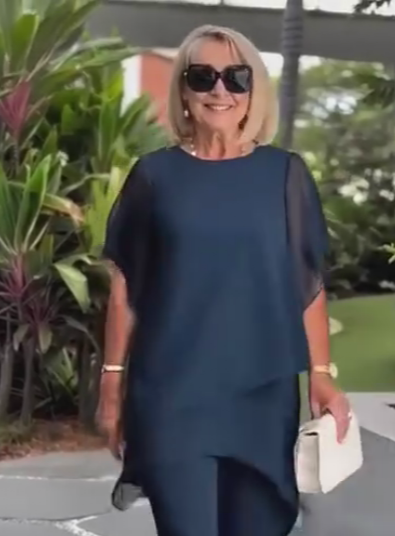 Garnitur damski składający się z bluzki z okrągłym dekoltem, bufiastymi rękawami i szerokimi nogawkami.
