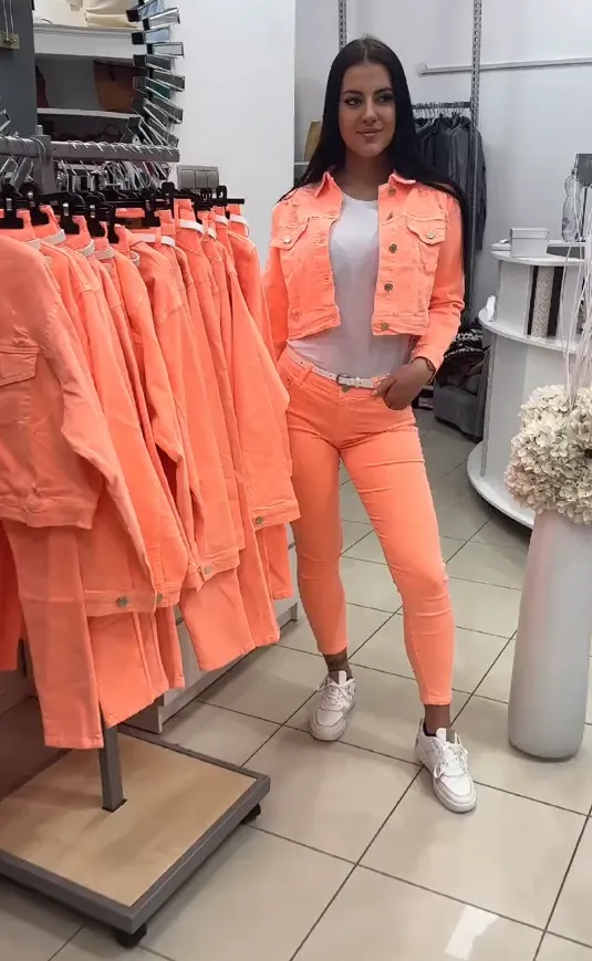Letnia wyprzedaż 79% 🔥100% zwrotu pieniędzy 🔥Wyprodukowano w Polsce 🔥Luźny, zapinany na guziki, krótki stan, nieelastyczny komplet jeansowy składający się z kurtki i spodni z kieszeniami. Modelka ma na sobie rozmiar S.