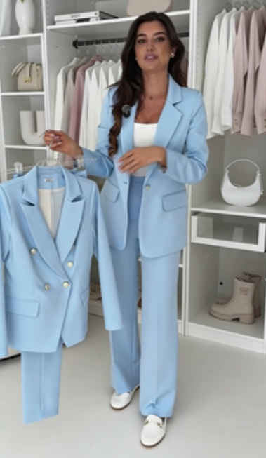 Wygodny damski garnitur, składający się z dopasowanej marynarki z paskiem po bokach i luźnych spodni.
