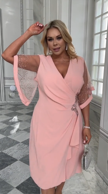 Krótka sukienka, dekolt w serek, półprzezroczysta, z zakładkami.
