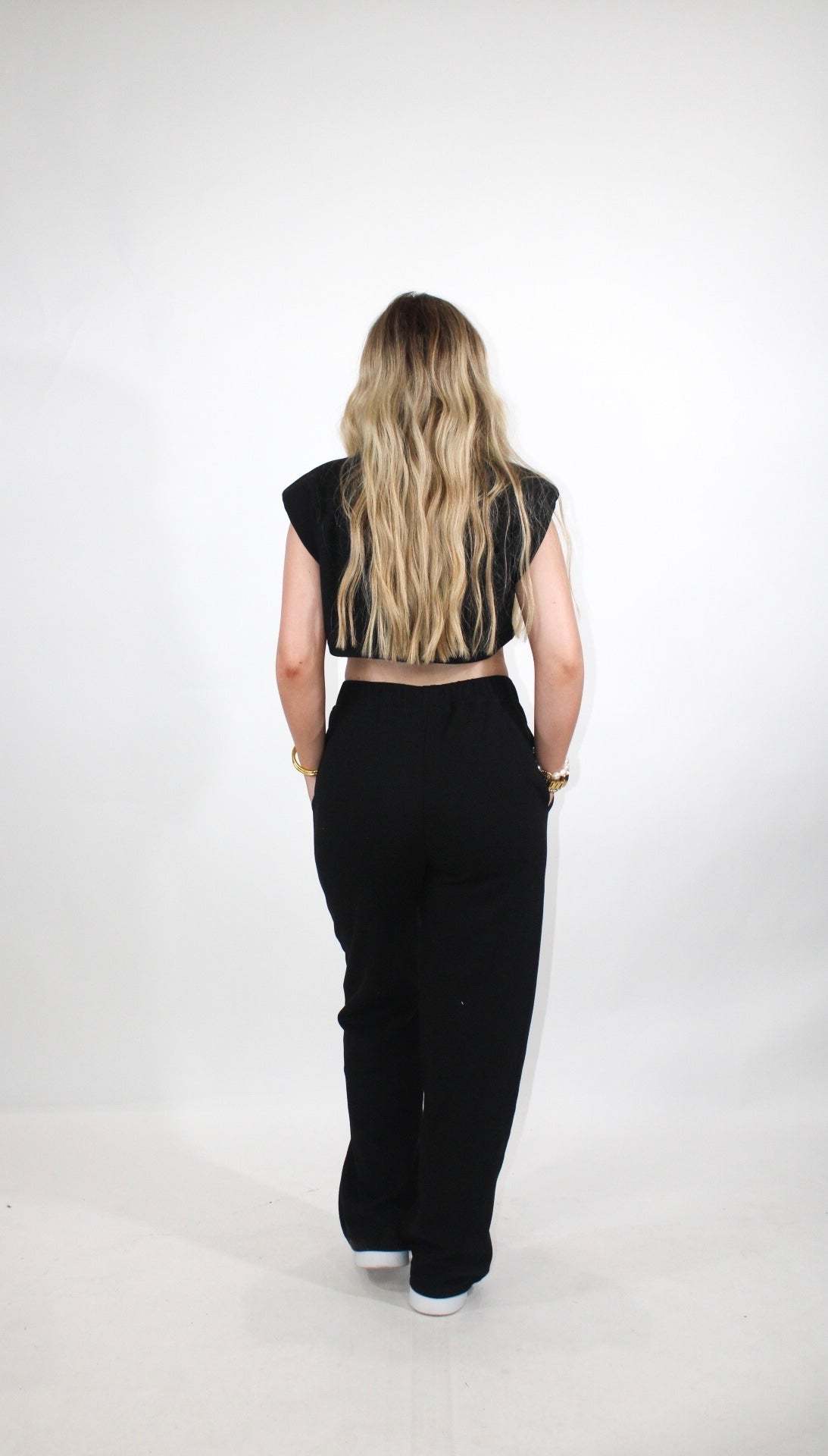 Rachel is 5'3 wearing a size small.- Black waffle knit set- Sleeveless top with shoulder pads- True to size