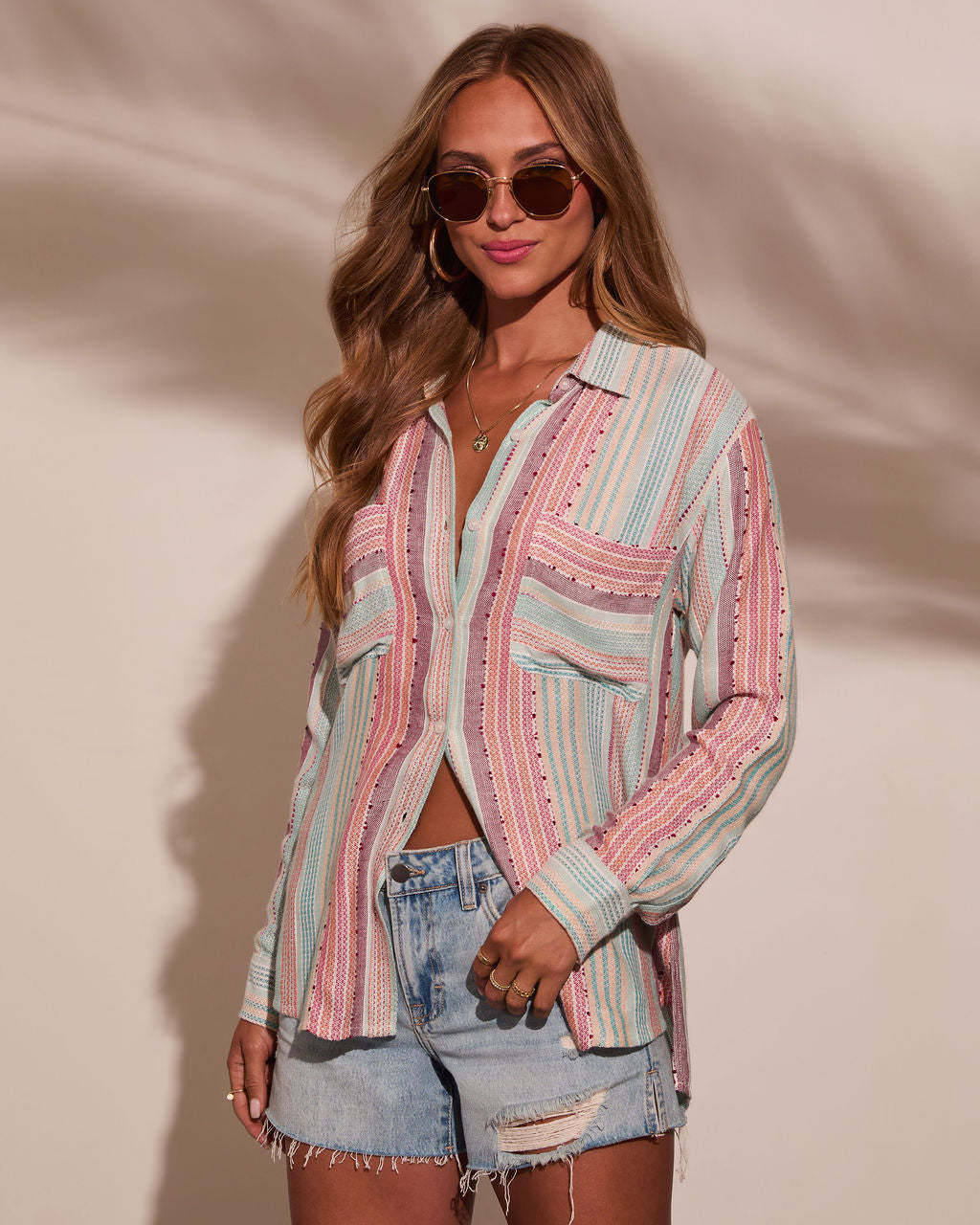 Meet your new layering legend: the Larson Striped Button Down Top. Made from lightweight knit fabric with a playful multicolor stripe design, it’s like a fresh breeze for your wardrobe. The classic collared neckline, front button closures, and handy breast slip pockets bring timeless appeal, while the curved shirttail hem adds just the right amount of flow.