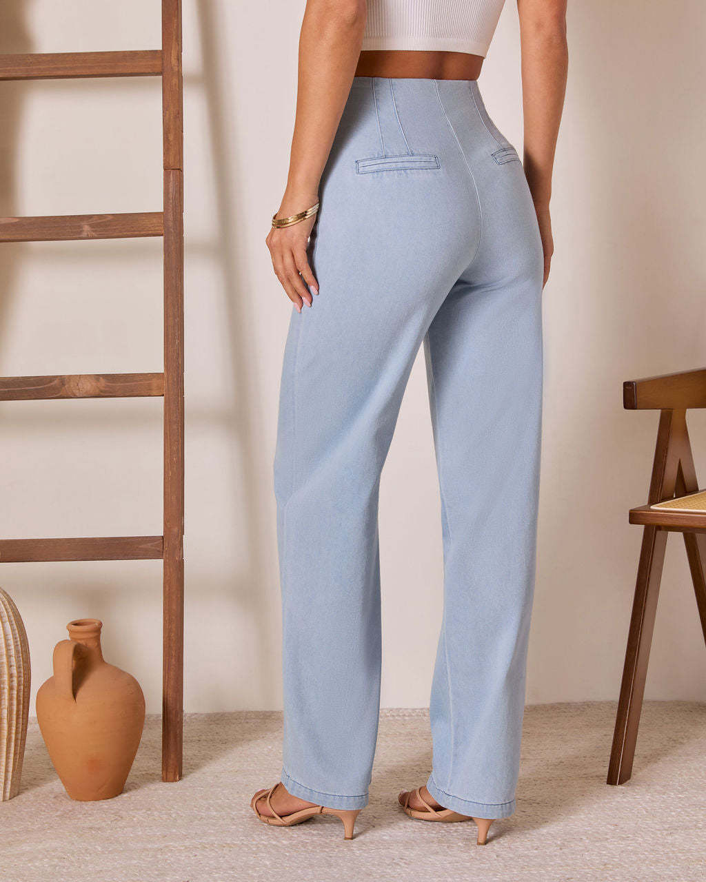 Tailored and timeless the Lianne High Rise Denim Pants are your summer upgrade to everyday denim. Designed in structured yet lightweight linen fabric, they strike the perfect balance between polished and breathable. The high-rise fit elongates your silhouette, while subtle faux back welt pockets keep the lines clean and elevated. Pair them with the matching Lianne Denim Button Down Vest Top (sold separately) for the full power look.