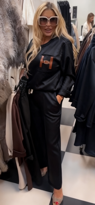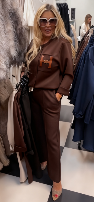 Strój składający się z bluzki ozdobionej ozdobnymi detalami w kształcie litery „H” oraz wygodnych spodni z kieszeniami.