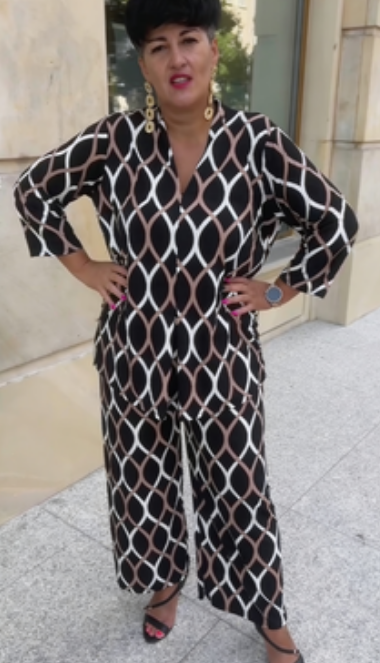- Miękka, gładka tkanina + bluzka z dekoltem V i rękawami 3/4 + wzór geometryczny + szerokie