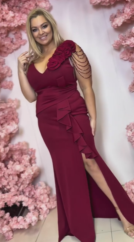 Długa, wieczorowa suknia w dużym rozmiarze z falbaną u dołu, rozcięciem i zdobiona trójwymiarowymi motywami kwiatowymi.