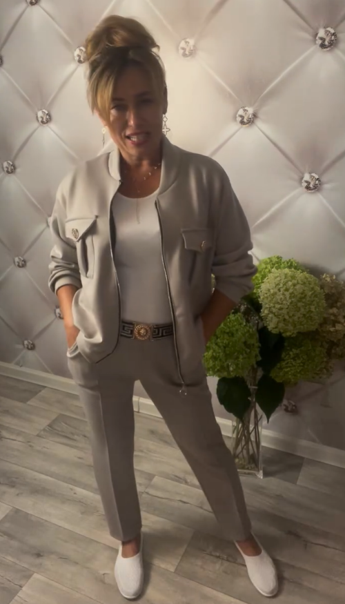 zapewnia szybkie zakładanie i elegancki wygląd. Dwie kieszenie na piersi z metalowymi guzikami dodają funkcjonalności i stylowych detali. Luźniejszy krój górnej części doskonale maskuje ramiona i plecy, a długie rękawy sprawiają, że zestaw jest uniwersalny na różne pory roku.