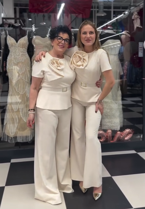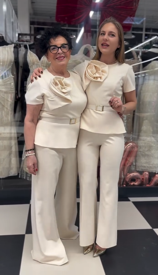 rękawami oraz szerokich spodni palazzo z ozdobną trójwymiarową kwiatową aplikacją i złotym paskiem w talii. Ten zestaw to synonim