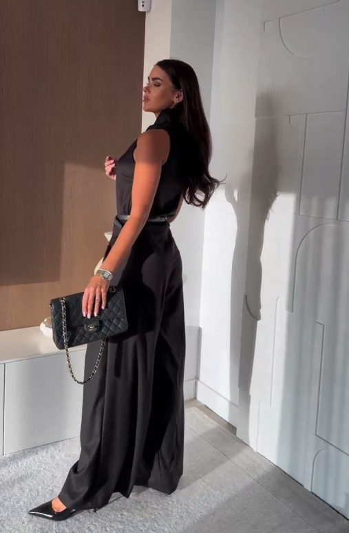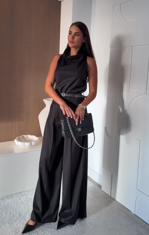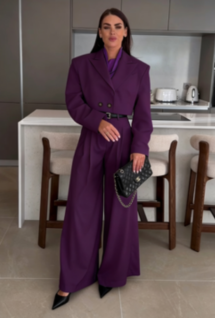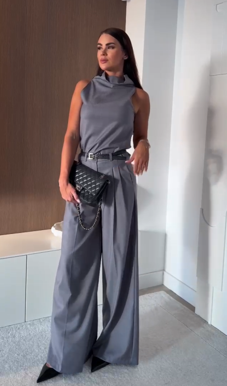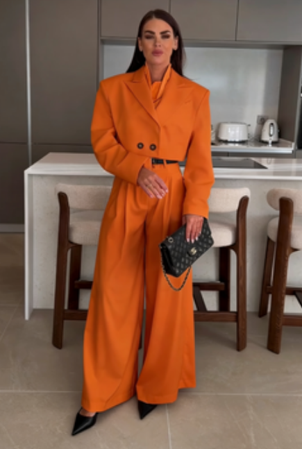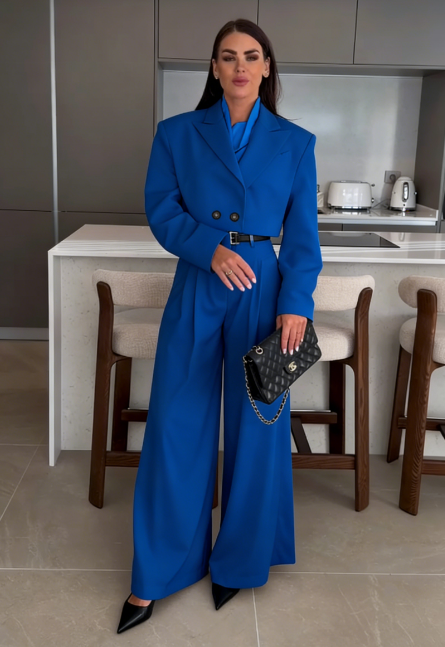 Trzyczęściowy komplet składający się z krótkiej marynarki, bezrękawnego topu typu halter oraz spodni z wysokim stanem i szerokimi nogawkami.