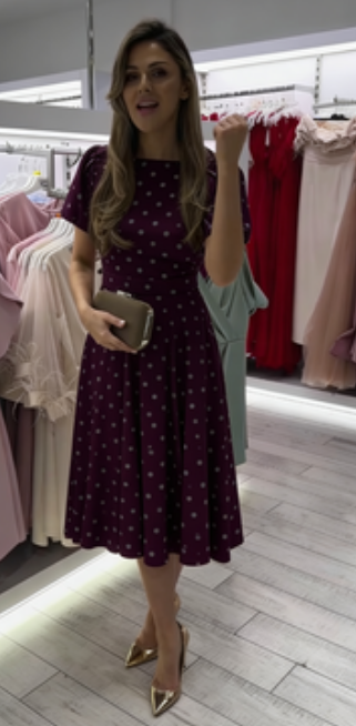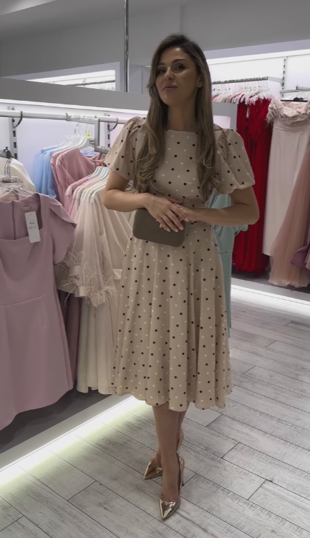 Przedstawiamy ponadczasową sukienkę midi z klasycznym wzorem kropkowym, która łączy w sobie elegancję,