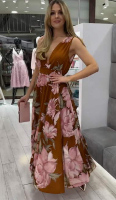 Przedstawiamy wyrafinowaną sukienkę maxi w eleganckim, czarnym odcieniu z dużym, różowym wzorem kwiatowym – połączenie