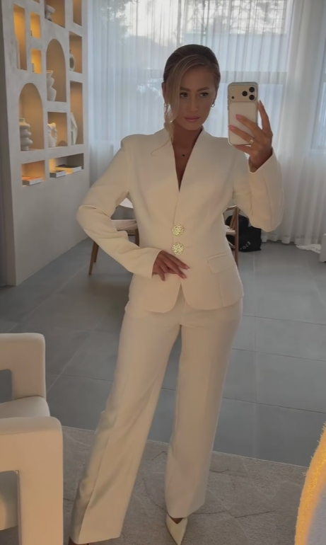 - Dwuczęściowa konstrukcja: Komplet składa się z eleganckiego żakietu i spodni szerokich, oferując uniwersalny