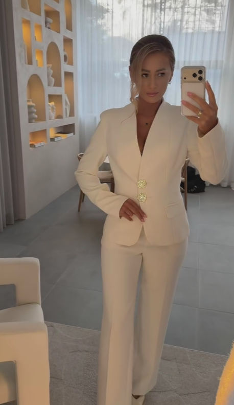 - Ozdobne guziki: Dwa duże, zdobione guziki na żakiecie dodają luksusowego akcentu i stają się centralnym elementem