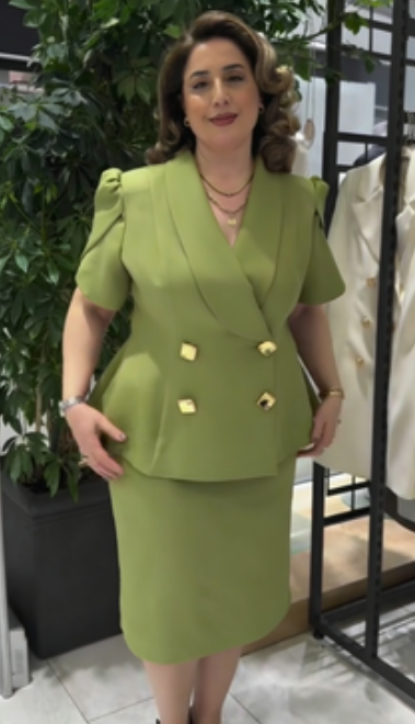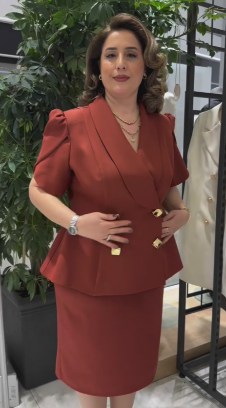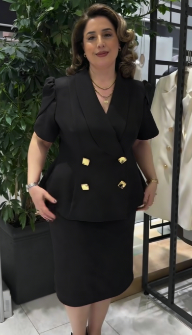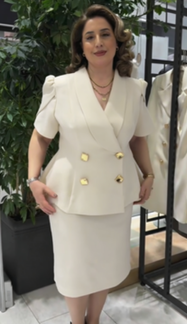 żakietu z charakterystycznym dekoltem V oraz ołówkowej spódnicy, tworząc imponujący, gotowy look w kilka sekund. Dostępny