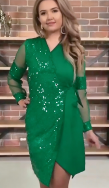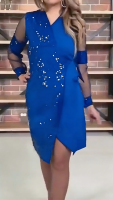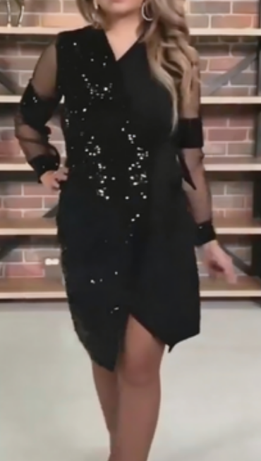 Sukienka z cekinowym dekoltem w serek, prześwitującymi długimi rękawami i rozcięciem