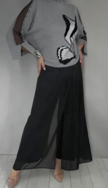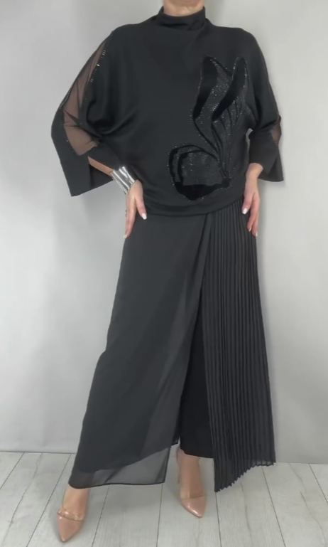 Dwuczęściowy komplet z jednolitym kolorem i cekinami, z wysokim kołnierzem, przezroczystymi rękawami i czarnym wzorem z motylami.