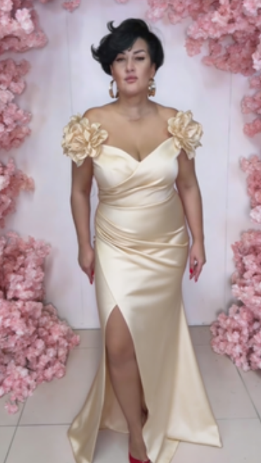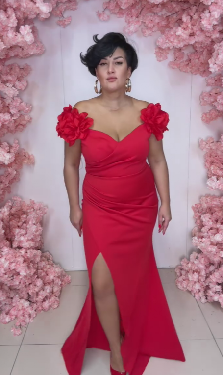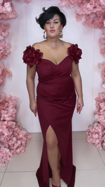 Sukienka damska o dopasowanym kroju, jednolity kolor, dekolt w serek, trójwymiarowe zdobienie kwiatowe