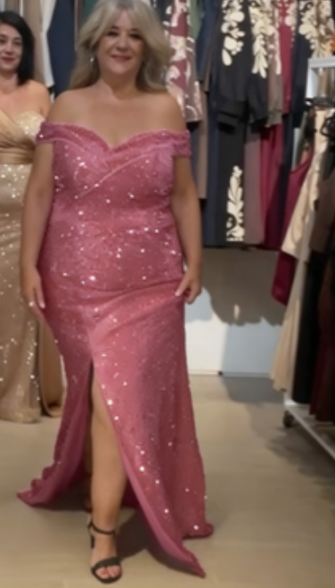 Sukienka z cekinami, odsłaniająca ramiona i rozcięciem na spódnicy.