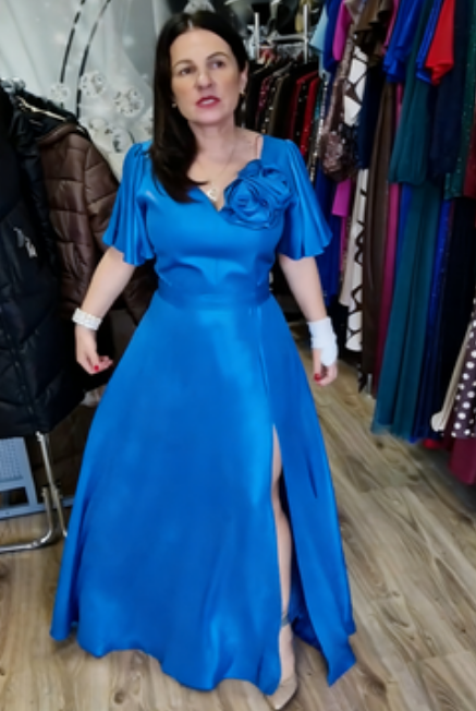 Elegancka suknia wieczorowa z głębokim dekoltem w serek i kwiatowymi zdobieniami z przodu.