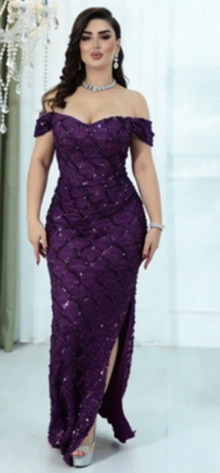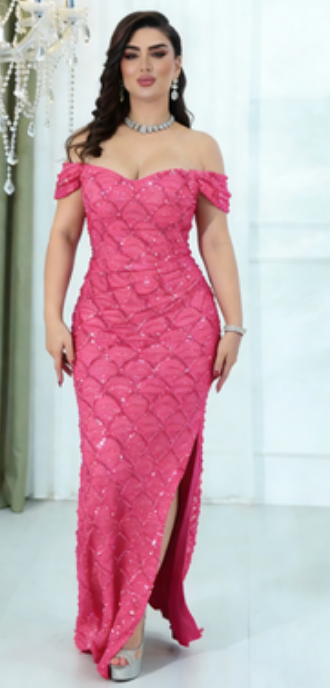 Błyszcząca wieczorowa suknia typu rybi ogon ozdobiona łuskami.