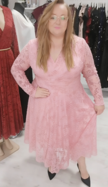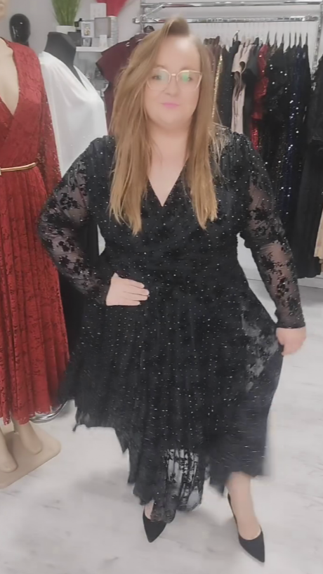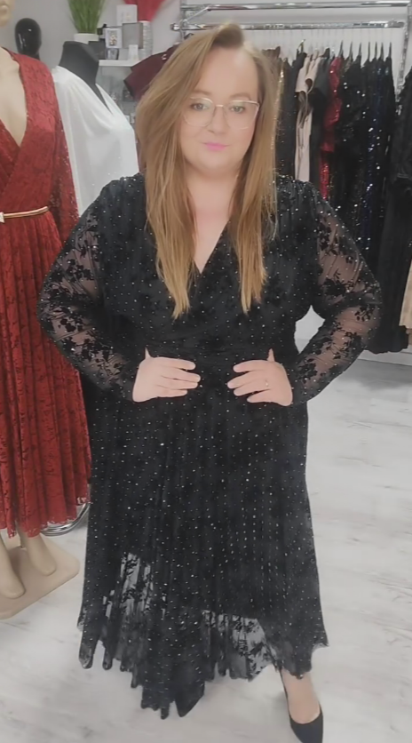 Elegancka sukienka maxi plus size z koronką i błyskiem: luksusowy styl na uroczystości