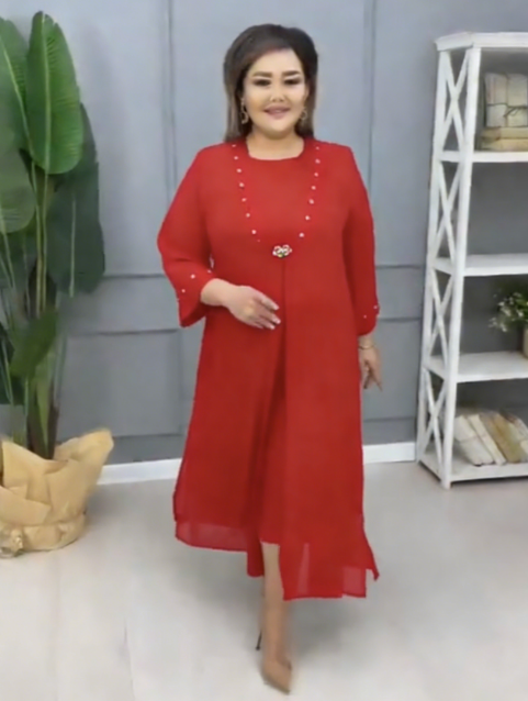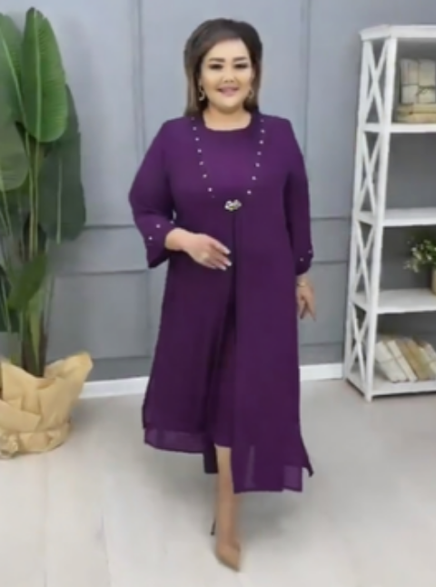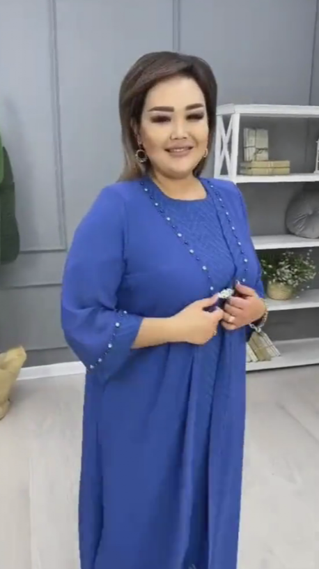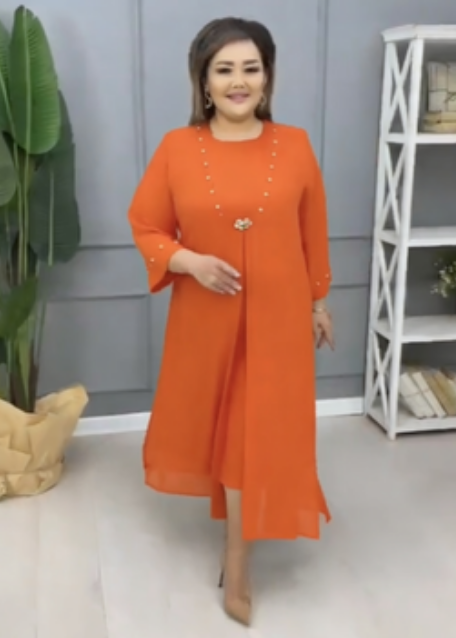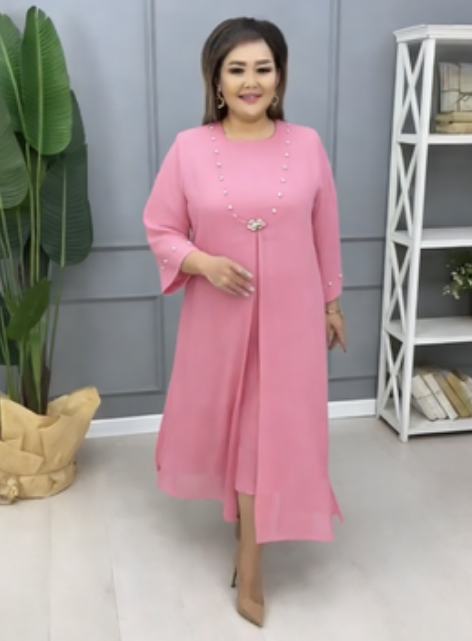 Sukienka z okrągłym dekoltem i rękawami o długości ¾, z przezroczystą warstwą zewnętrzną i dwuwarstwową warstwą wewnętrzną.