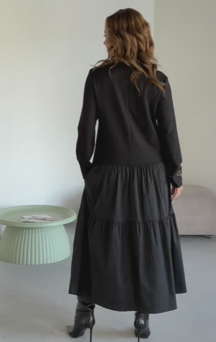 • Stylowe detale zipu i falistej spódnicy: Czarny materiał oraz centralny zip + wielokrotna falista spódnica – dodają charakteru, nadając lookowi nowoczesny, wyrafinowany wydźwięk.