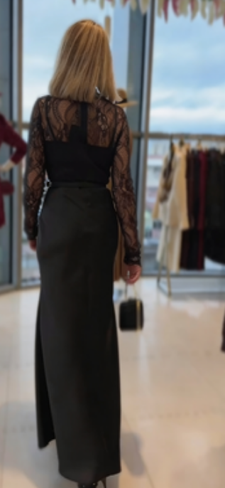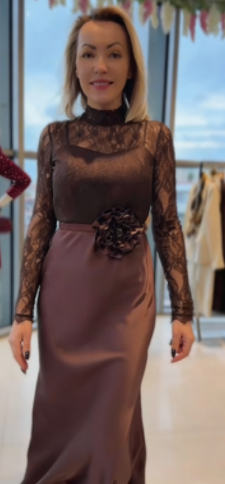Elegancka damska sukienka z koronkowymi rękawami i trójwymiarowymi kwiatowymi zdobieniami w talii.