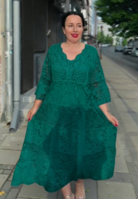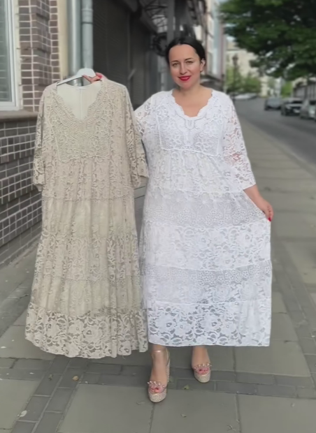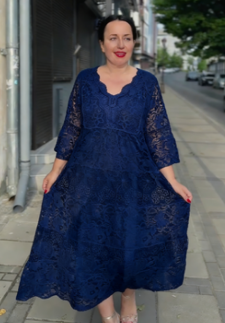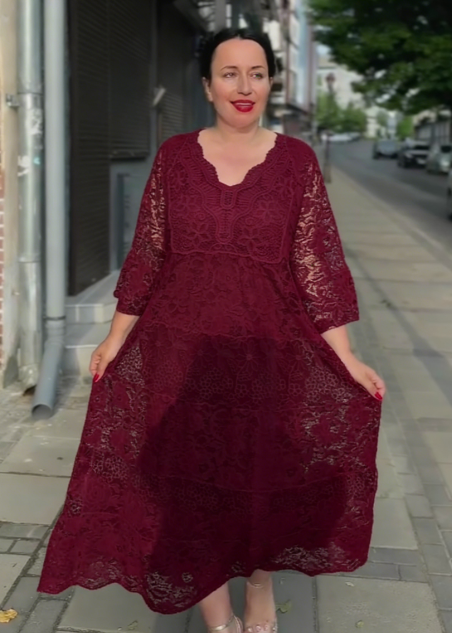 Ta długa sukienka z koronki ma luźny, warstwowy krój typu "tort", który idealnie maskuje wady sylwetki i zapewnia