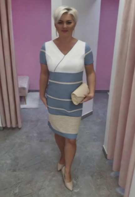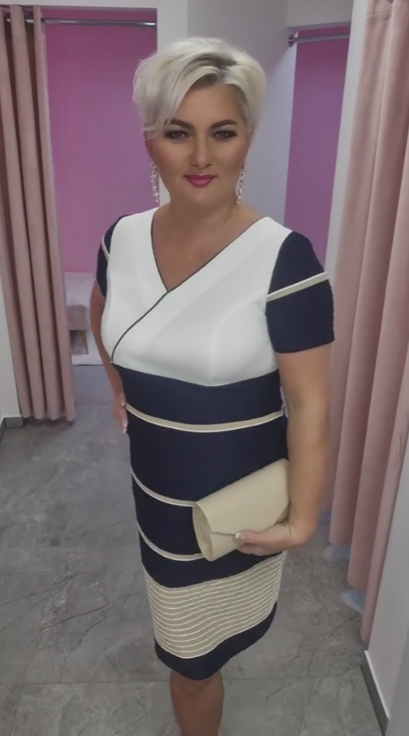 Przedstawiamy wyrafinowaną sukienkę ołówkową w klasycznym, czarno-białym wzorze z beżowymi akcentami – połączenie głębokiego dekoltu V oraz krótkich rękawów. Ta sukienka to synonim kobiecej pewności siebie i profesjonalnego stylu, idealny dla kobiet, które chcą łączyć elegancję z komfortem podczas spotkań biznesowych, uroczystych obiadów lub innych formalnych wydarzeń w sezonie wiosenno-jesiennym.