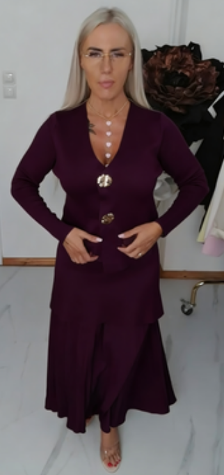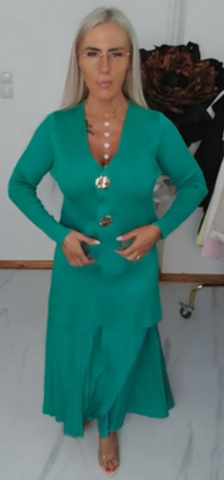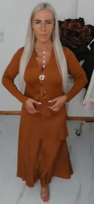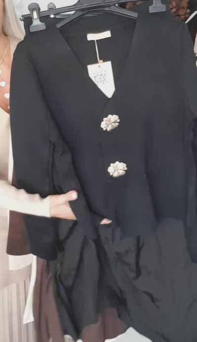 Wyrafinowany, stonowany, a jednocześnie elegancki strój składający się z kwiatowego kardiganu zapinanego na guziki oraz asymetrycznej spódnicy.