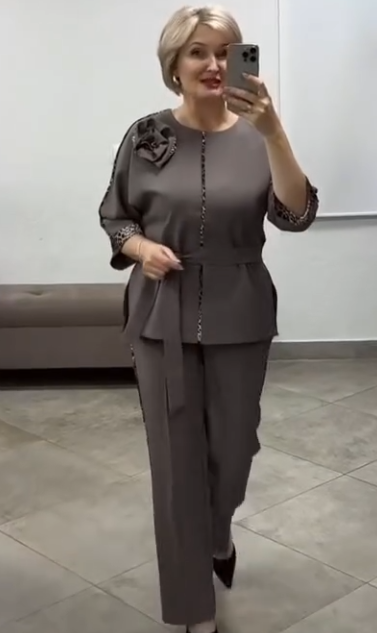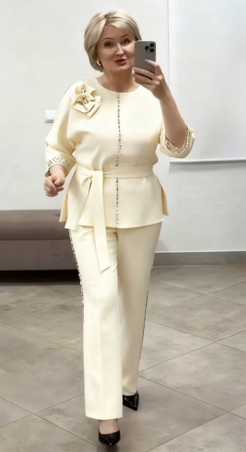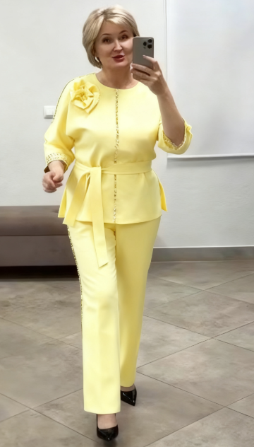Dwuczęściowy damski kostium casualowy, jednolity kolor, zdobiony kryształkami i trójwymiarowymi kwiatami.
